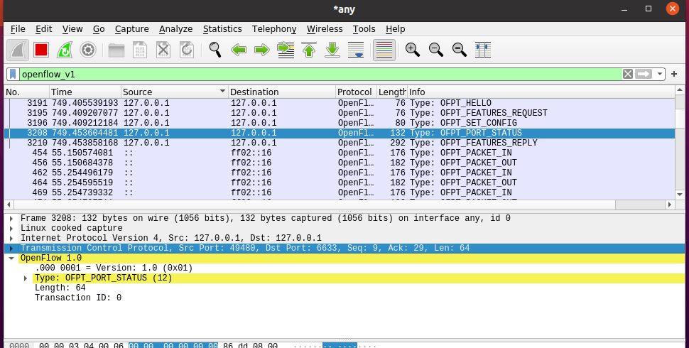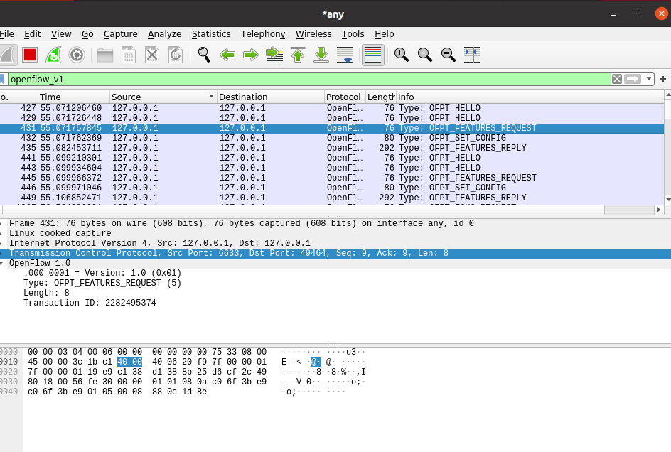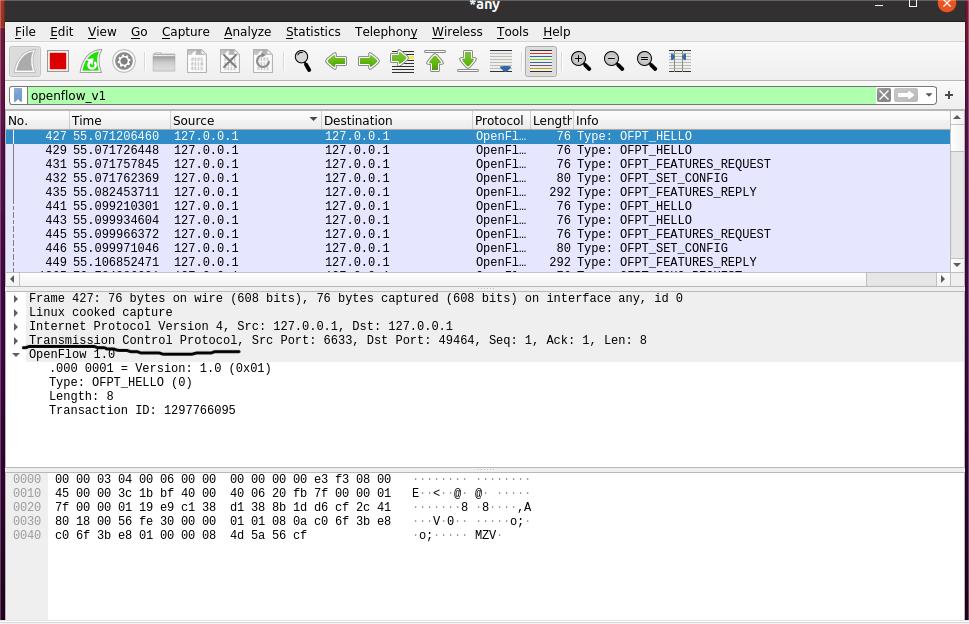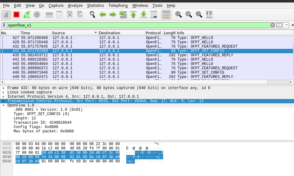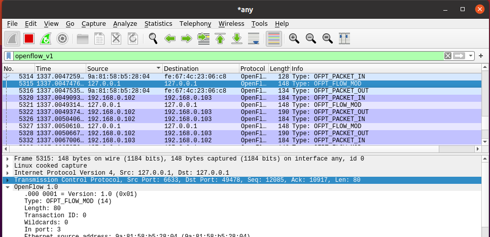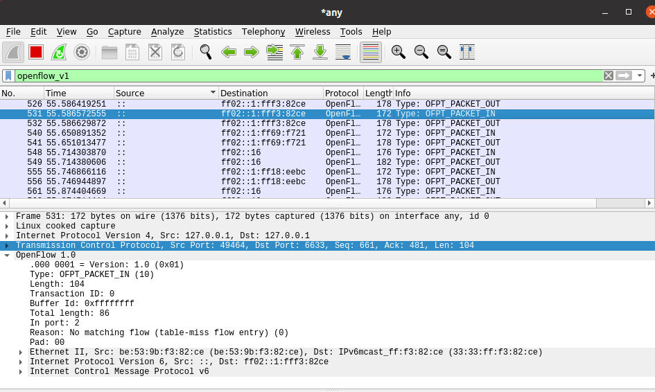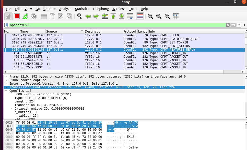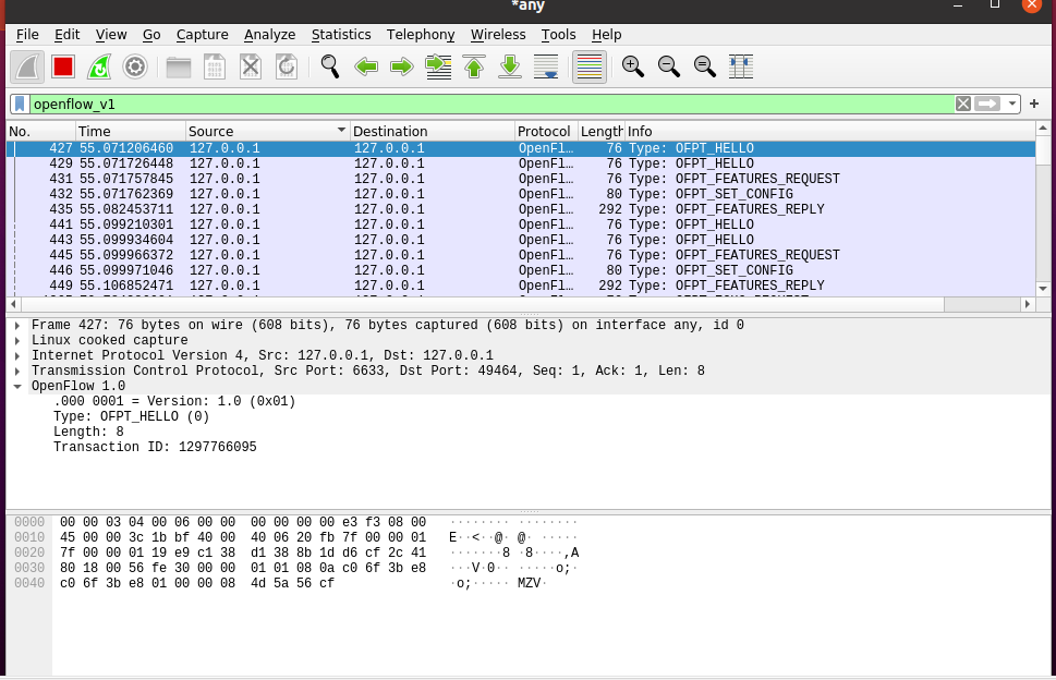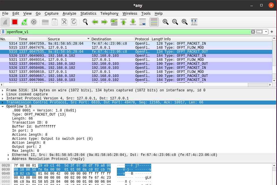 - 能够运用 wireshark 对 OpenFlow 协议数据交互过程进行抓包;