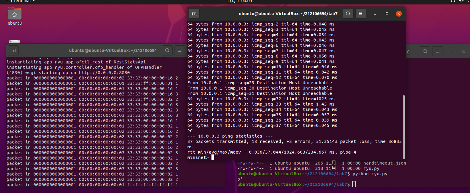 此次实验是之前实验的总结,综合难度比较高。在做odl的时候,由于以前一直没有更改默认的python版本号,以前使用的python命令是python3,但是这次做的时候忘记了,导致一直使用python,打开python文件,结果一直错误,但是之后改用了python3 的打开方式之后,解决问题。还有就是在ryu控制器的时候,打开控制器后创建了拓扑但是无法ping通,之后我删除了mininet的缓存,重新启动虚拟机,再打开ryu控制器,结果一切顺利