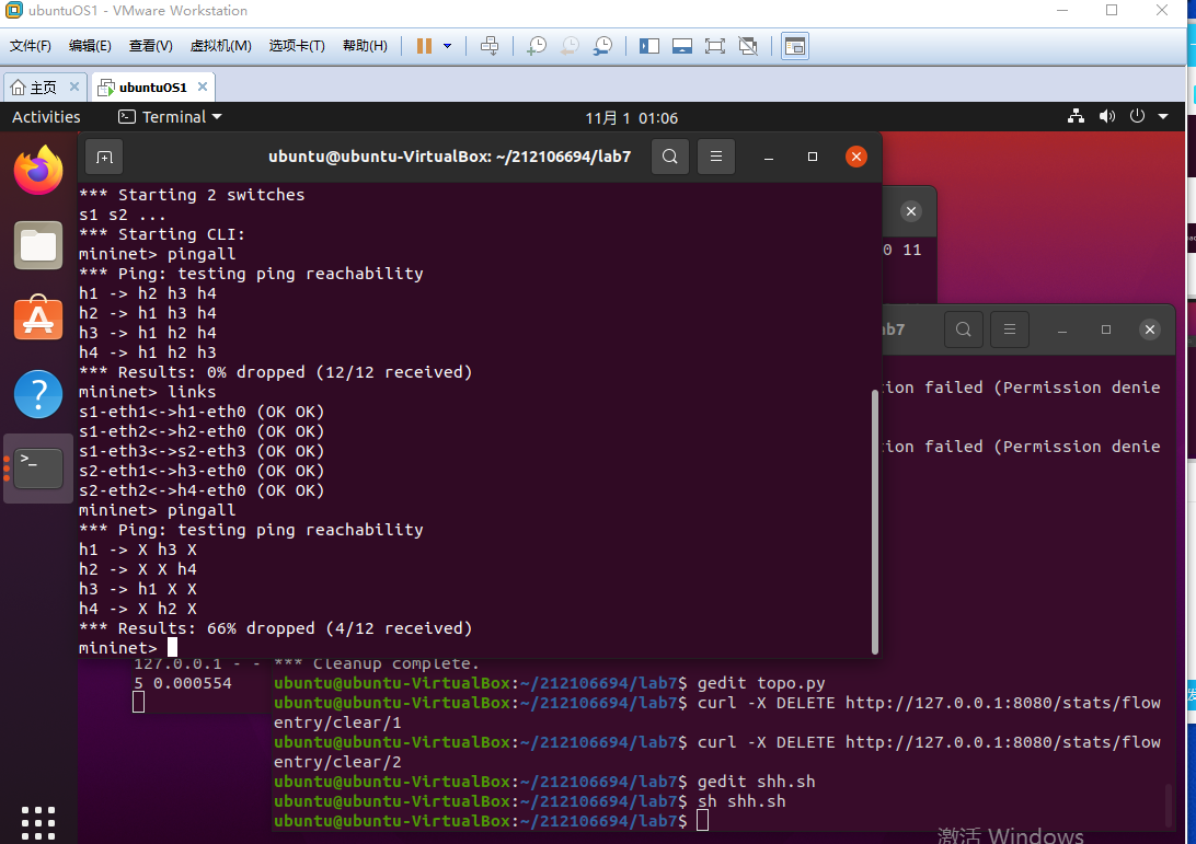(1) 利用Mininet平台搭建下图所示网络拓扑,并连接OpenDaylight;![]()