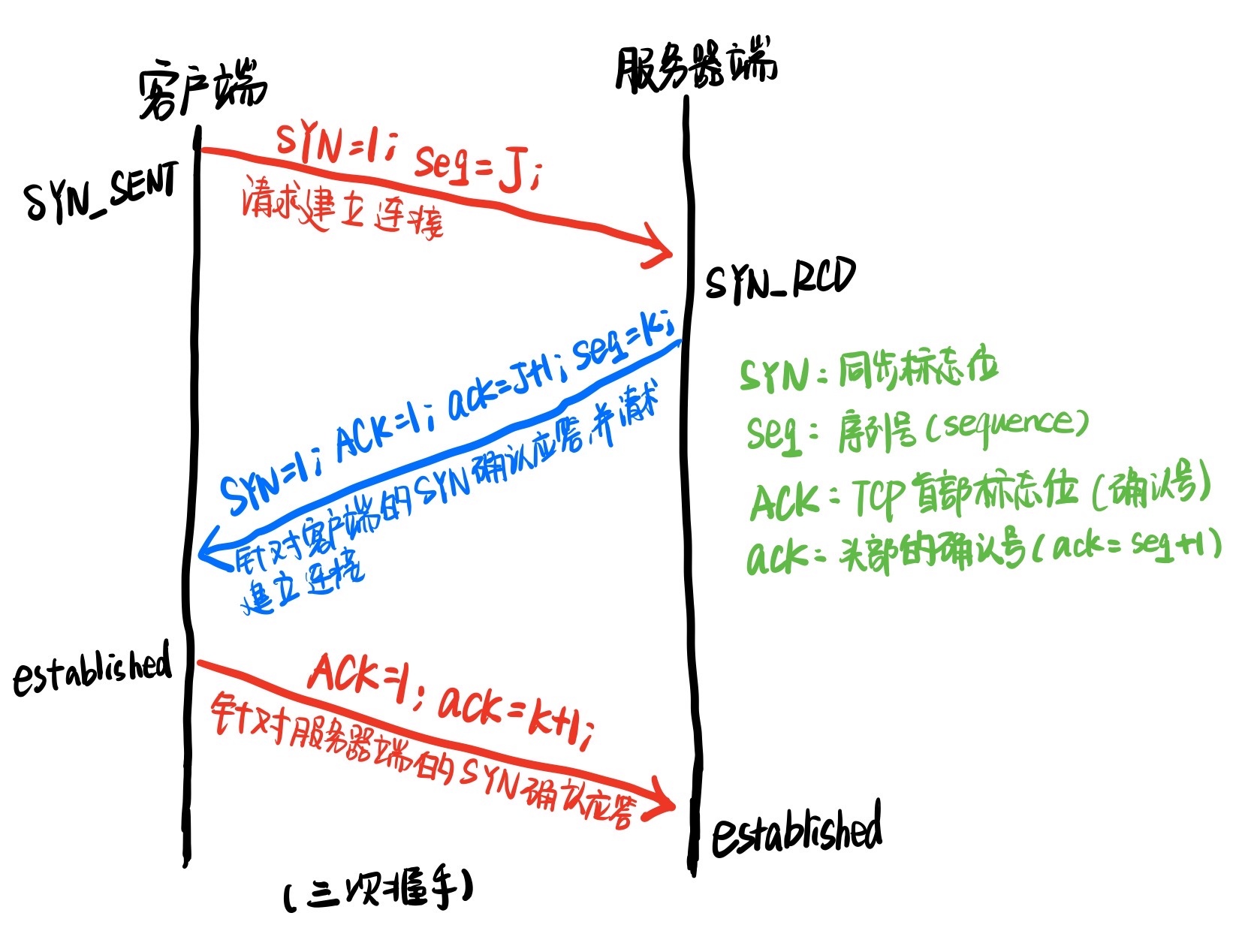 第三次握手是由客户端针对服务器端SYN确认应答的报文,此时ACK置1,确认号ack=K+1。服务器端在接收到该报文后,进入established状态。