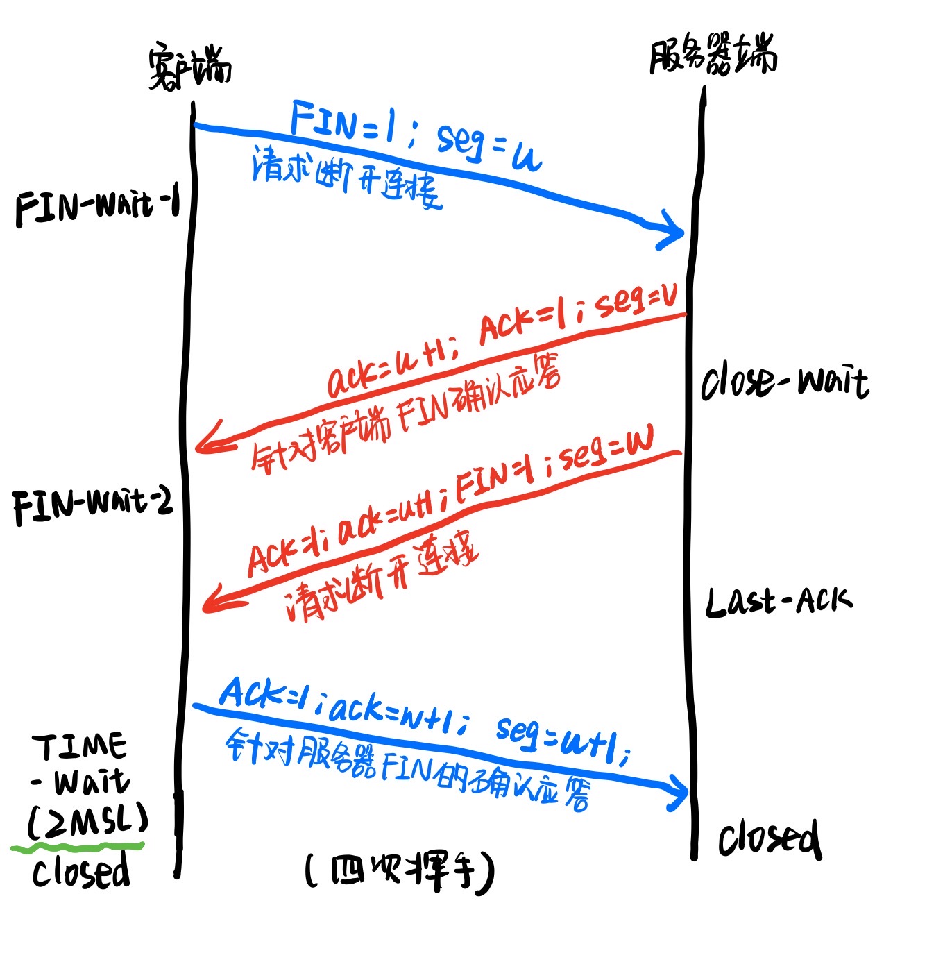 第四次挥手是由客户端发送的针对服务器FIN的确认应答,报文中的ACK置1,ack=w+1,seq = u+1,客户端在发送完该报文后进入TIME_WAIT状态,若客户端在第四次挥手中 发送的ACK报文在网络中丢失了,那么服务器就会重发FIN报文,如果客户端在发完这个ACK报文后立即关闭连接而没有TIME_WAIT,就无法收到服务器重发的FIN报文,导致服务器无法正常关闭TCP连接,而如果客户端在TIME_WAIT状态足足等待了2MSL后,客户端都未接收到服务器端的FIN报文,则说明最后的确认应答报文服务器已接收,可以直接关闭连接。