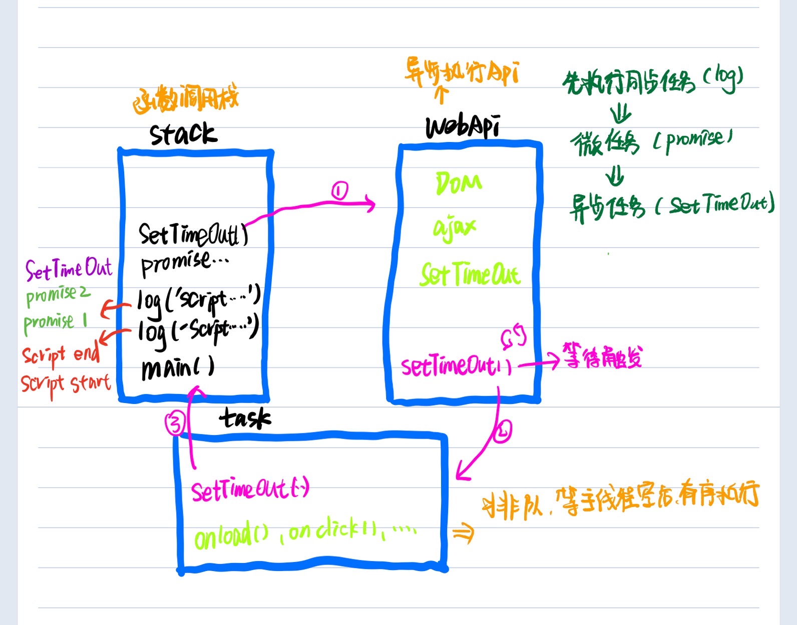 在JS引擎主线程执行过程中:首先执行宏任务的同步任务,打印script start 和script end的同步任务先入栈出栈执行, SetTimeOut()异步任务入栈后,主线程认为其是异步API任务,会放入WebAPI中监控和控制,等待触发。而后再是微任务promise入栈执行。而SetTimeOut()在满足触发条件后,即计时达到4ms,(尽管SetTimeOut是0ms,也会需要先放入WebAPI中等待执行,低于4ms一律视为4ms)。定时器线程就把该回调处理函数推进任务队列中等待主线程执行,然后JS引擎主线程继续向下执行,当主线程空闲后,开始依次读取任务队列中的事件,如此循环。