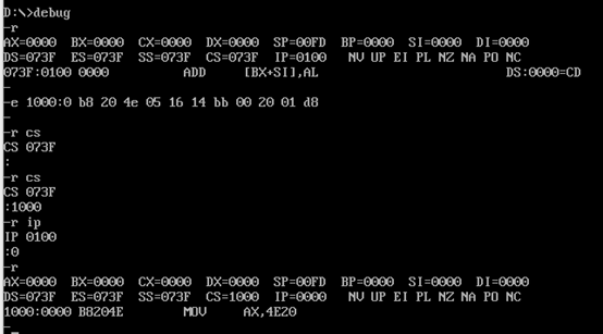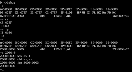 ①使用r命令查看并修改cs:ip为2000:0,再进行a命令的写入: