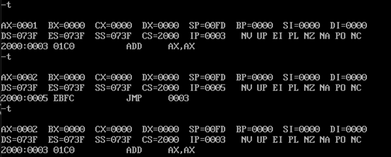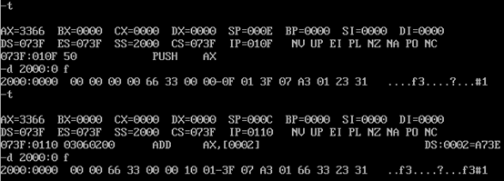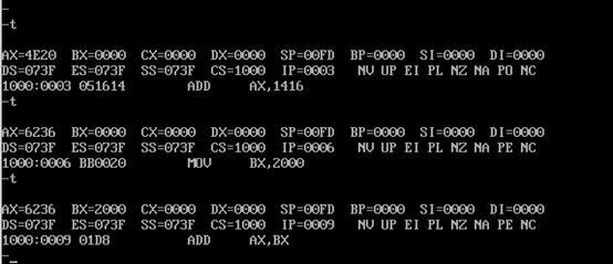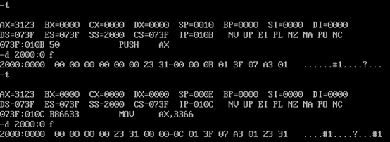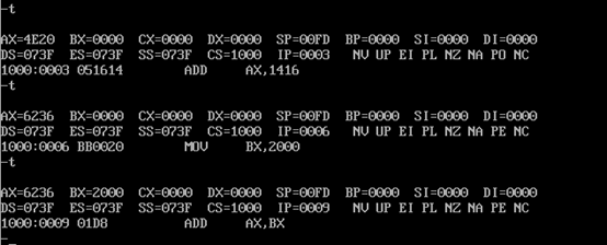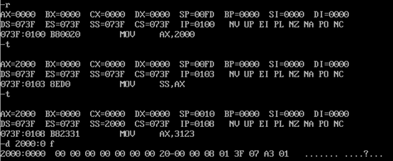 2000:0~2000:f 的值。观察每一条指令执行后相关寄存器值的变化,及 2000:0~2000:f 单元