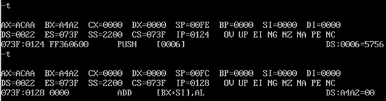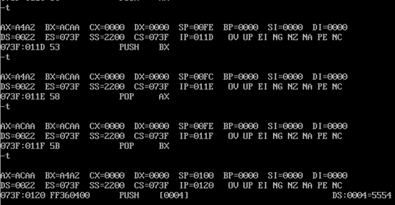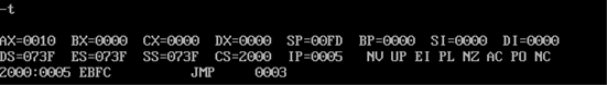 答:指令mov sp,10在执行时并未显示,原因是t命令在执行修改段寄存器的指令时,会自动执行下一条指令mov sp,10。