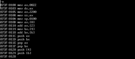 (用e命令和a命令两种方式,写入内存。用t命令单步调试。)