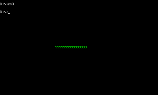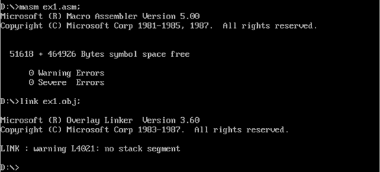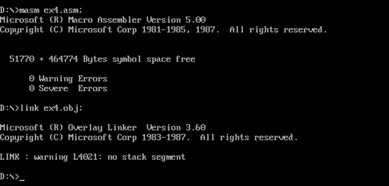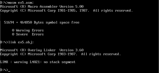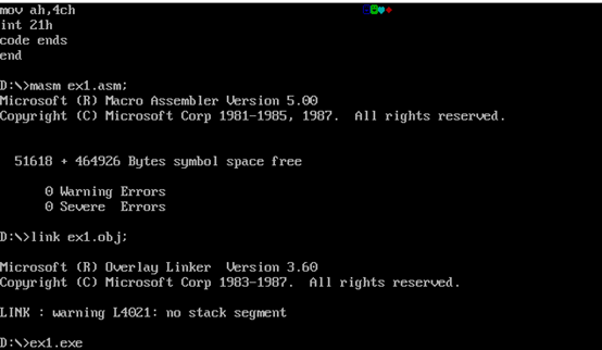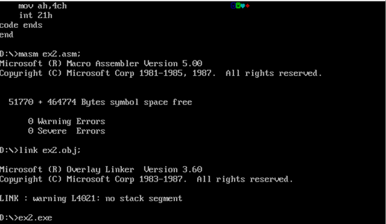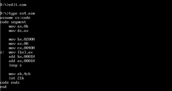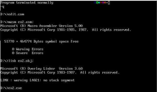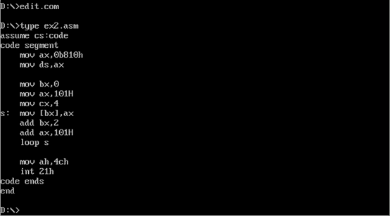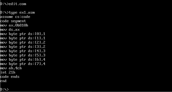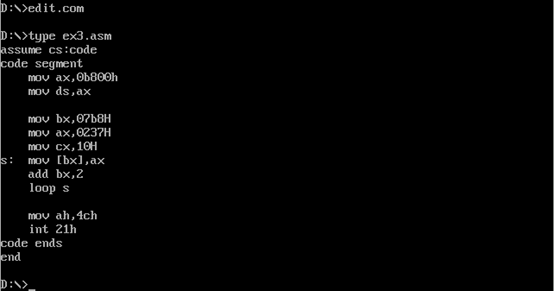 结论分析:ex1.asm和ex2.asm实现了相同的效果和功能,但是ex1.asm是直接寻址,而ex2.asm是通过寄存器bx间接寻址,ex2.asm把4改成了8,所以输出了八个图案。