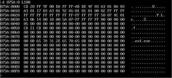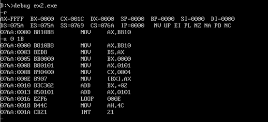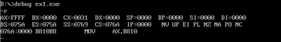 使用debug加载ex1.exe文件,并使用u命令进行精准反汇编