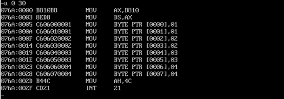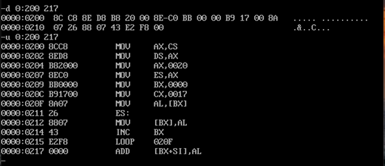 用d命令查看0:200之后的若干字节,并用u命令进行反汇编发现代码复制成功
