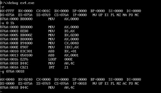 把ex2.asm中line9 mov cx, 4 改成 mov cx, 8后的重新汇编、链接、执行结果如下:
