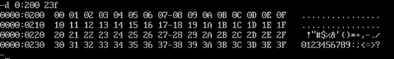 用d命令查看0:200~0:23F,确认有将0~63传送至此段内存区域
