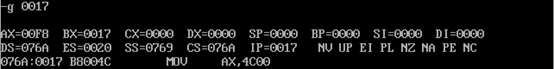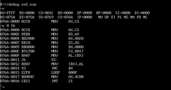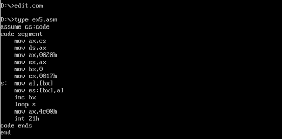 因为要复制mov ax,4c00之前的代码,所以cx循环次数应该为指令长度减去5个字节(或者00到16)为17H个字节。