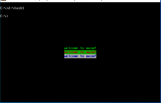 编程:在屏幕中间分别显示绿色、绿底红色、白底蓝色的字符串'welcome to masm!'。