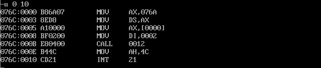 assume cs:code, ds:data data segment str db 80 dup(?) data ends code segment start: mov ax, data mov ds, ax mov si, 0 s1: mov ah, 1 int 21h mov [si], al cmp al, '#' je next inc si jmp s1 next: mov cx, si mov si, 0 s2: mov ah, 2 mov dl, [si] int 21h inc si loop s2 mov ah, 4ch int 21h code ends end start
