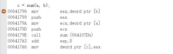 先将参数b 的值存入寄存器eax,再压入堆栈,再将参数a 的值存入寄存器ecx,再压入堆栈。