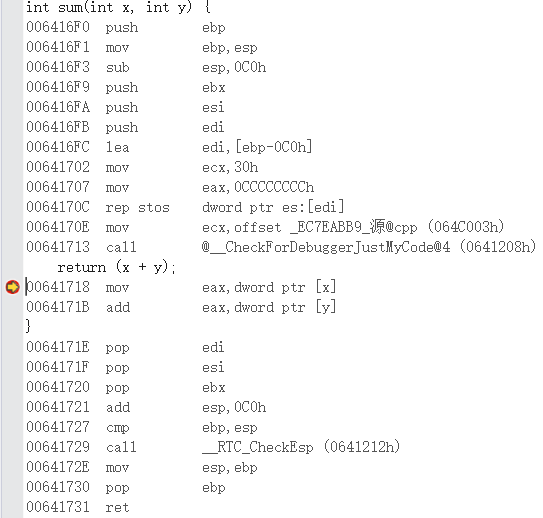 通过call命令调用sum函数,返回值通过eax寄存器带回。