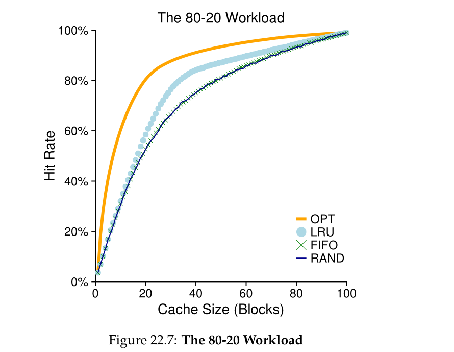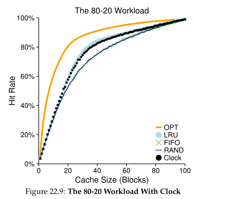 - 当所有需要调用的page都放入高速缓存中时,所有策略的cache hit都是100%。