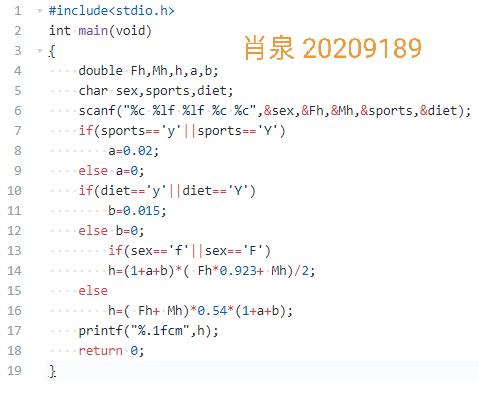 数据表达:变量:双精度浮点型Fh,Mh,h,a,b;字符型变量sex,sports,diet; 数据处理:F:h=(1+a+b)*( Fh*0.923+ Mh)/2; M:h=( Fh+ Mh)*0.54*(1+a+b); 根据sports,diet判断分别赋值a,b