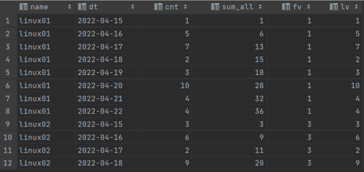 ==注意:== 这里也是一个动态的当第n行时,如果不做特殊指定,当到达第n行时,每组的窗口范围是 从第1行到第n行,因此第一组的窗口的FIRST_VALUE都是第1行的值,LAST_VALUE都是当前行的值