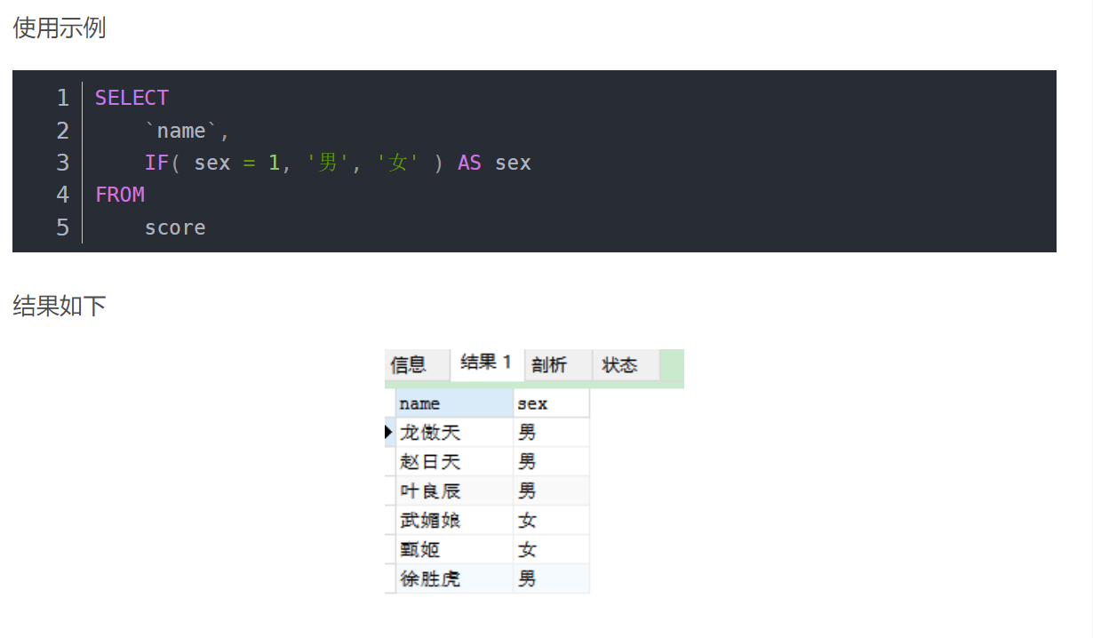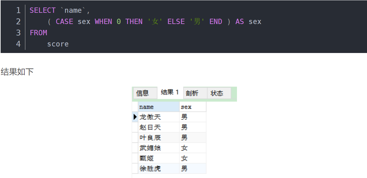 -- 如果字段值等于预期值,则返回结果 1 ,否则返回结果2