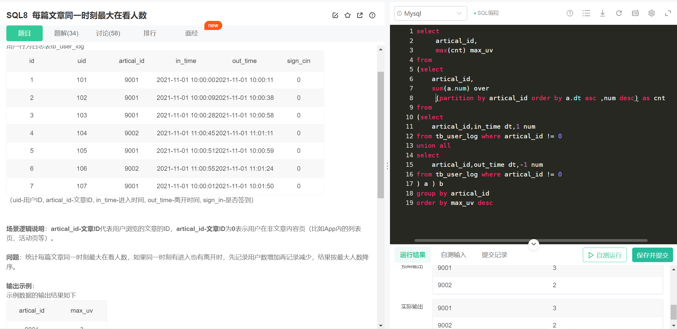 题目:每篇文章在同一时刻的最大观看人数