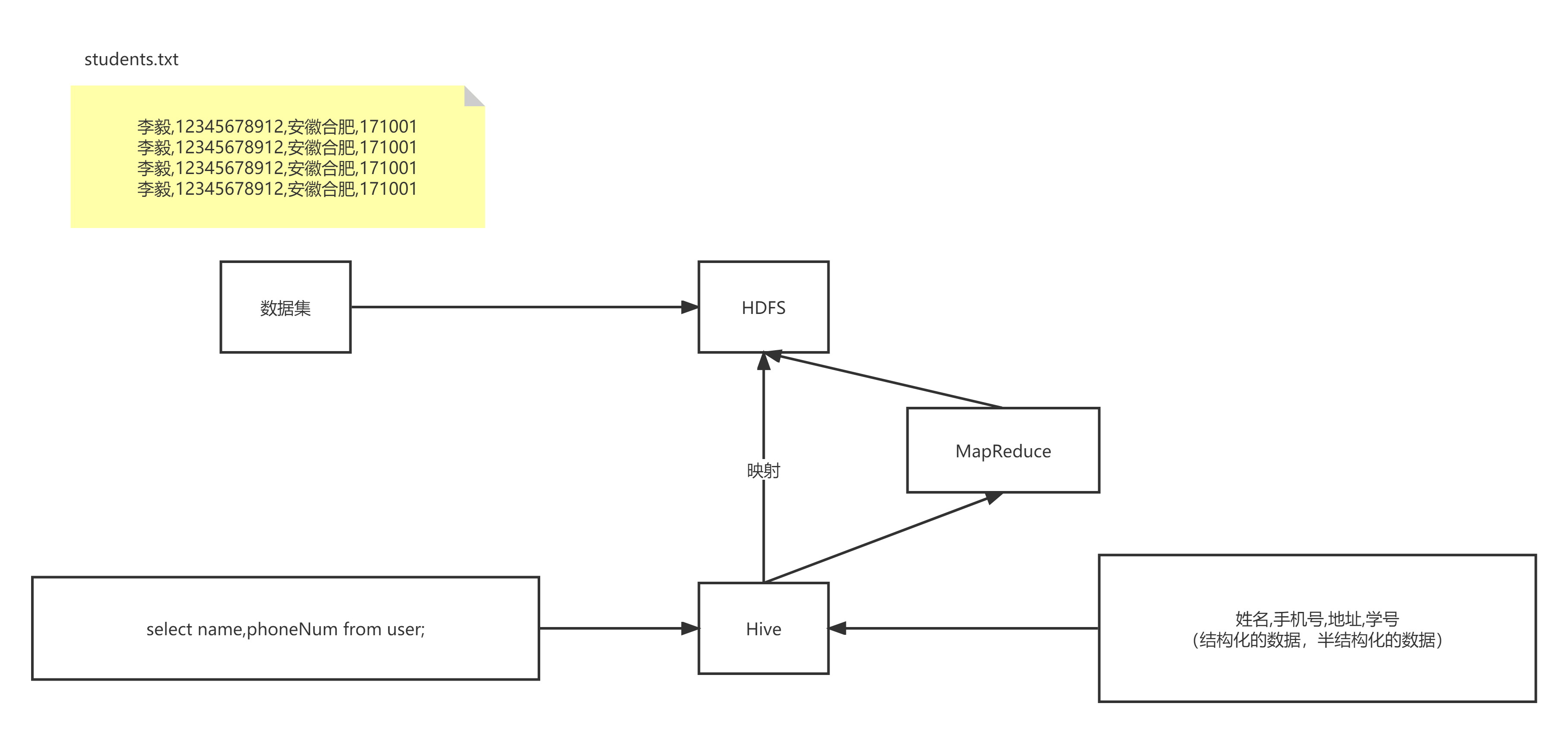 Hive本质是将SQL转换为MapReduce的任务进行运算,底层由HDFS来提供数据存储,说白了hive可以理解为一个将SQL转换为MapReduce的任务的工具,甚至更近一步说hive就是一个MapReduce客户端。