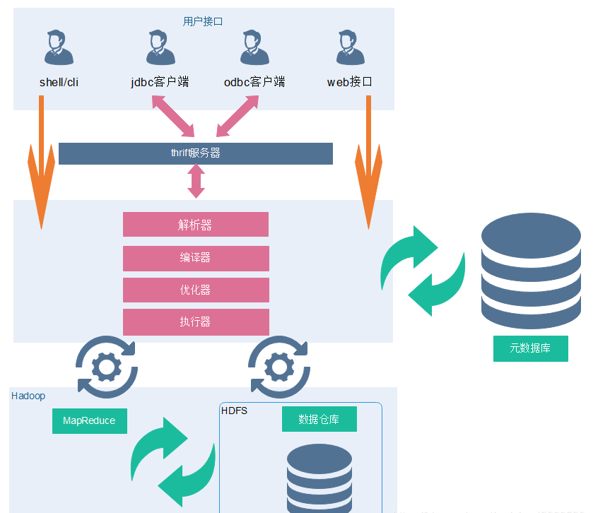 Hive允许client连接的方式有三个CLI(hive shell)、JDBC/ODBC(java访问hive)、WEBUI(浏览器访问 hive)。JDBC访问时中间件Thrift软件框架,跨语言服务开发。DDL DQL DML,整体仿写一套SQL语句。