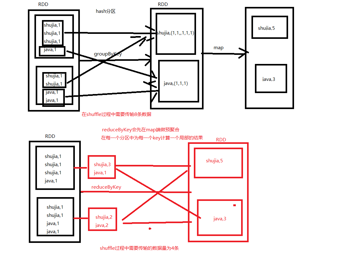 * reduceByKey会在map端预聚合,预聚合之后shuffle过程需要传输的数据量减少,性能更高