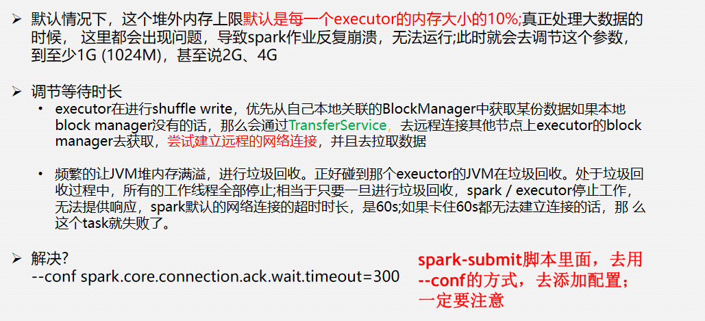 *参数调优建议*:Driver的内存通常来说不设置,或者设置1G左右应该就够了。唯一需要注意的一点是,如果需要使用collect算子将RDD的数据全部拉取到Driver上进行处理,那么必须确保Driver的内存足够大,否则会出现OOM内存溢出的问题。