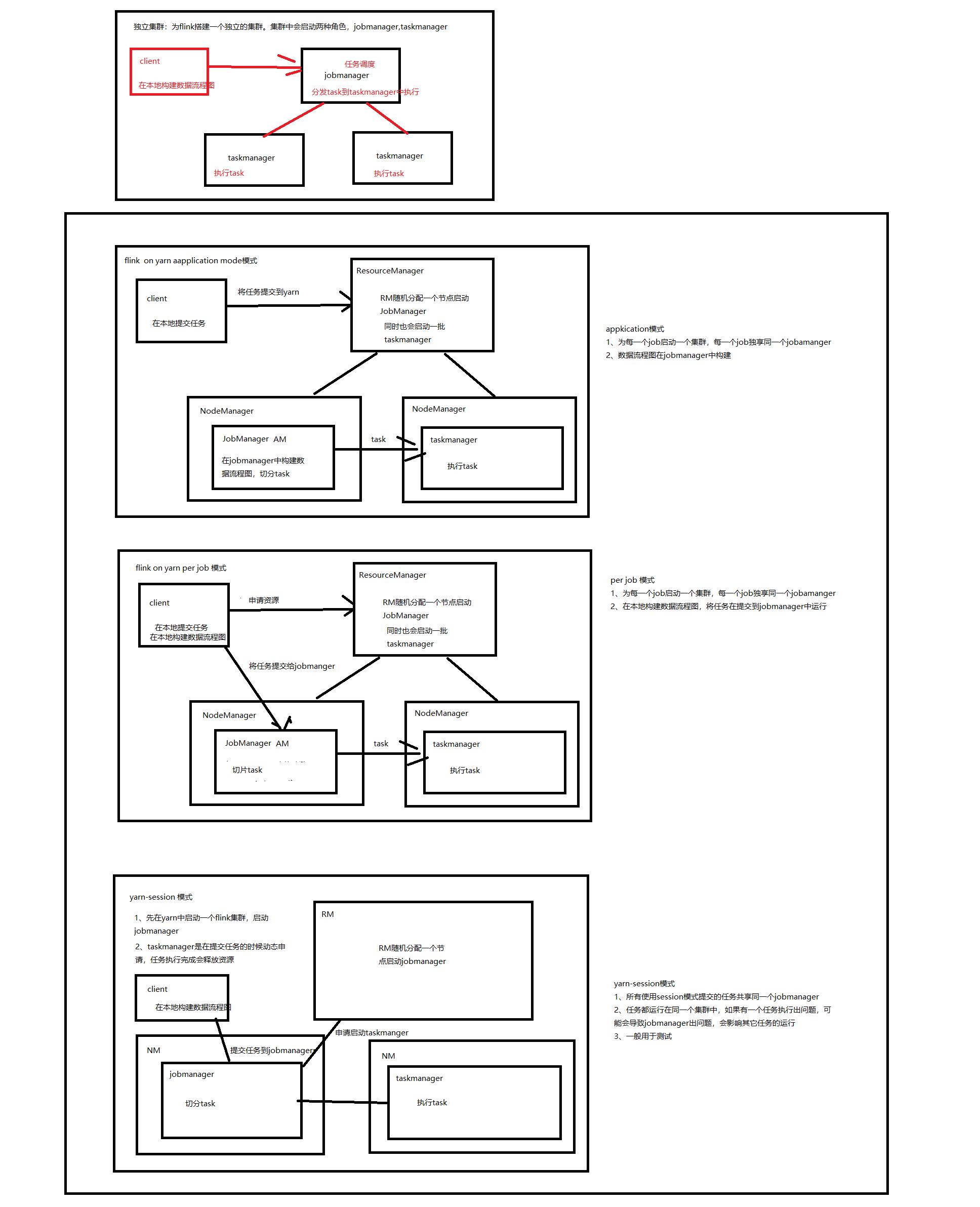 为每一个flink任务在yarn上启动一个集群,提交任务的main运行在jobmanager, 数据流程图在jobmanager中构建