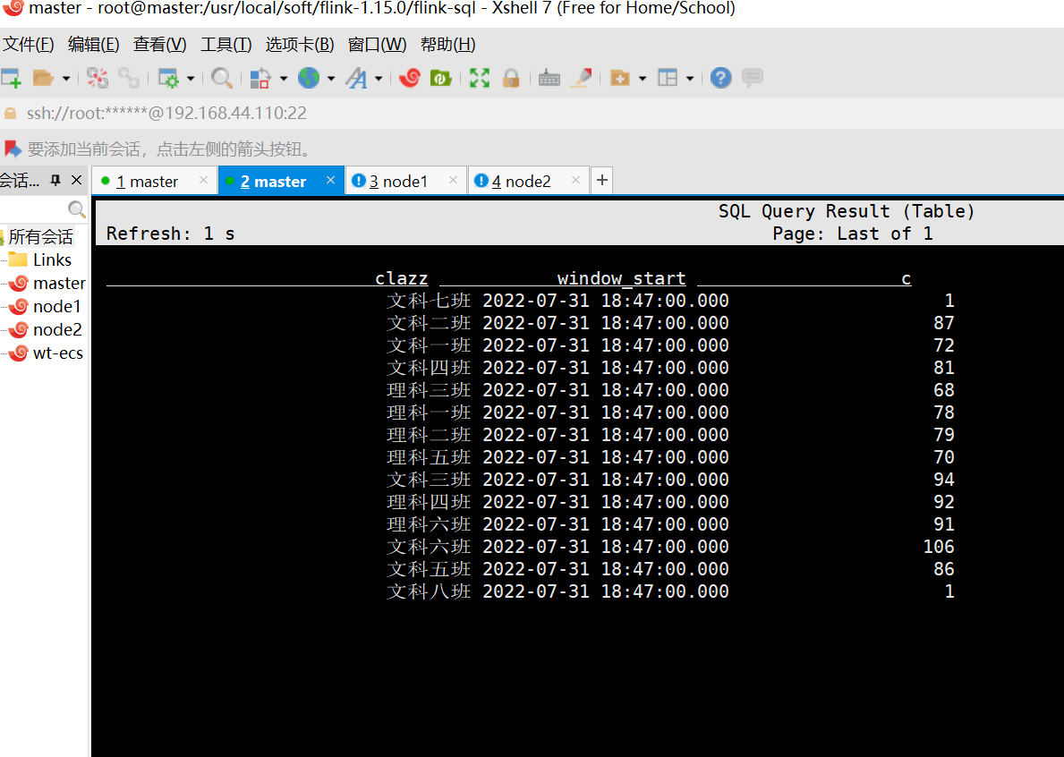 -- TIMESTAMP(3) flink的时间戳类型 -- ts - INTERVAL '5' SECOND 水位线前移5秒 CREATE TABLE student_kafka_event_time ( id STRING, name STRING, age INT, gender STRING, clazz STRING, ts TIMESTAMP(3), WATERMARK FOR ts AS ts - INTERVAL '5' SECOND -- 指定时间字段和水位线 ) WITH ( 'connector' = 'kafka', 'topic' = 'student_event_time', 'properties.bootstrap.servers' = 'master:9092,node1:9092,node2:9092', 'properties.group.id' = 'testGroup', 'scan.startup.mode' = 'earliest-offset', 'format' = 'csv' ) -- 使用事件时间 做窗口函数统计 -- 每一条数据都会计算出一个结果,会取更新之前已经输出的结果 -- 不存在数据丢失问题 -- 需要将统计结果保存在状态中 SELECT clazz,window_start,count(1) as c FROM TABLE( TUMBLE(TABLE student_kafka_event_time, DESCRIPTOR(ts), INTERVAL '5' SECOND) ) group by clazz,window_start -- 分钟窗口统计 -- 如果数据乱序可能会丢失数据 -- 不需要将统计的结果保存在状态中 select clazz, TUMBLE_START(ts, INTERVAL '5' SECOND) as s, -- 窗口开始时间 TUMBLE_END(ts, INTERVAL '5' SECOND) as e, -- 窗口开始使时间 count(1) as c from student_kafka_event_time group by clazz, TUMBLE(ts, INTERVAL '5' SECOND) -- 没4秒计算一次 -- 生产数据 kafka-console-producer.sh --broker-list master:9092,node1:9092,node2:9092 --topic student_event_time