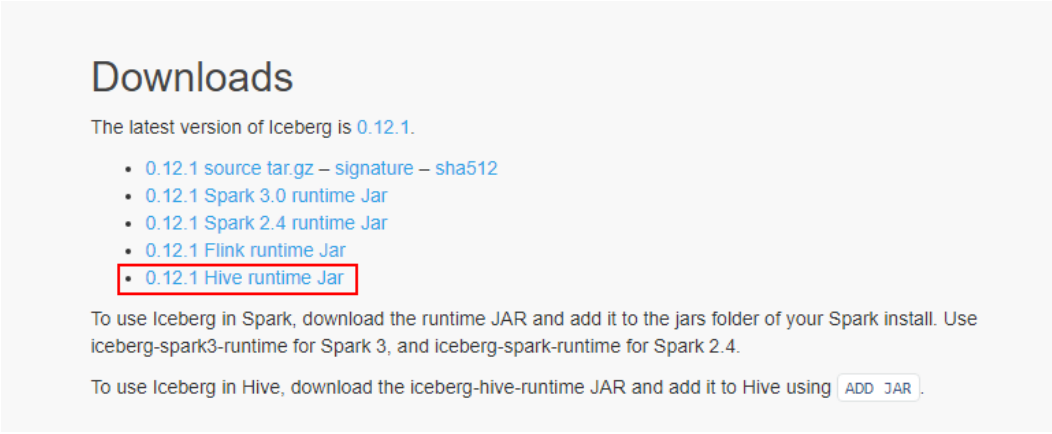 想要使用Hive支持查询Iceberg表,首先需要下载“iceberg-hive-runtime.jar”,Hive通过该Jar可以加载Hive或者更新Iceberg表元数据信息。下载地址:https://iceberg.apache.org/#releases/: