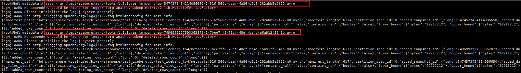 java -jar /test/iceberg/avro-tools-1.8.1.jar tojson snap-5474573454114086650-1-516f560d-baaf-4a86-b2b5-282abb5e2f22.avro