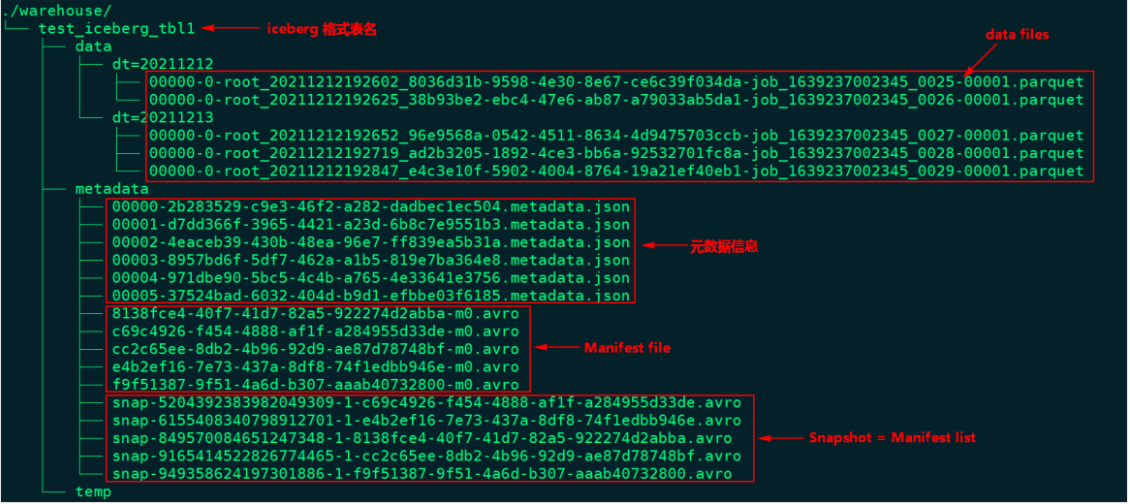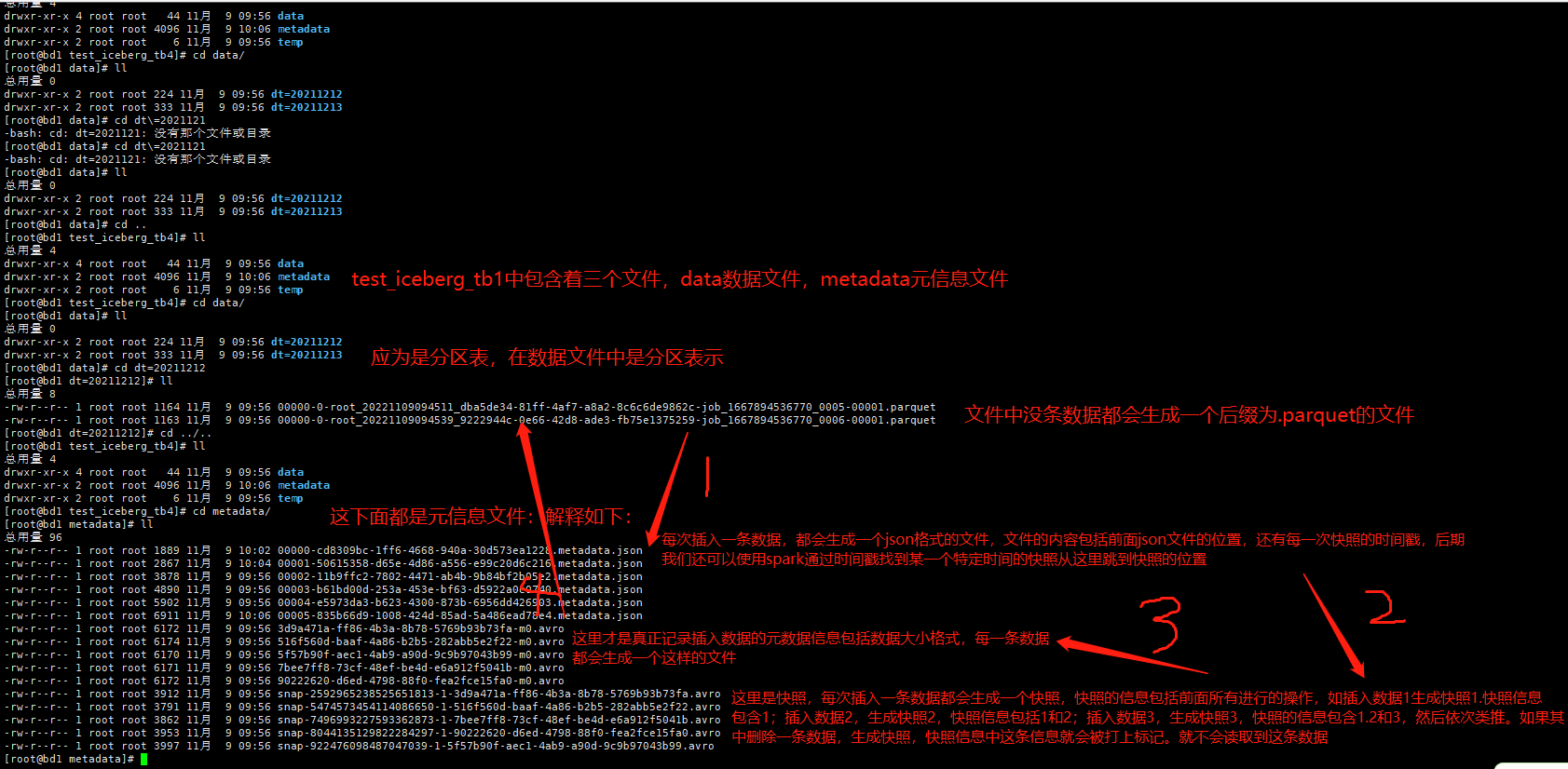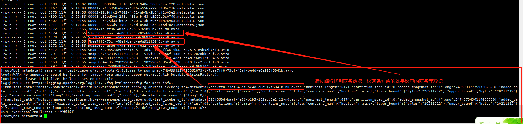 metadata是源文件:其中包含了有 JSON文件和AVRO后缀的文件。后面详细讲解、