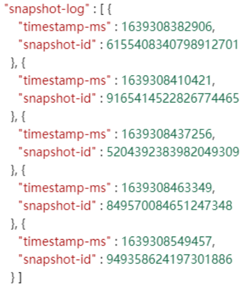 实际上通过时间戳找到对应数据文件的原理与通过snapshot-id找到数据文件原理一样,在*.metadata.json文件中,除了有“current-snapshot-id”、“snapshots”属性外还有“snapshot-log”属性,该属性对应的值如下: