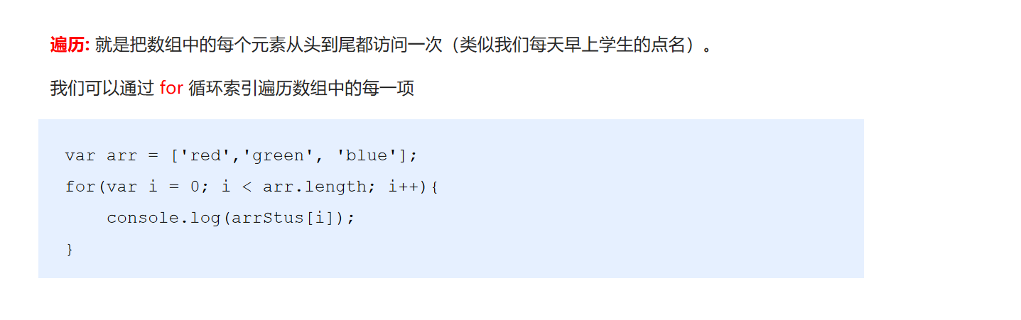 // 遍历数组:就是把数组的元素从头到尾访问一次
