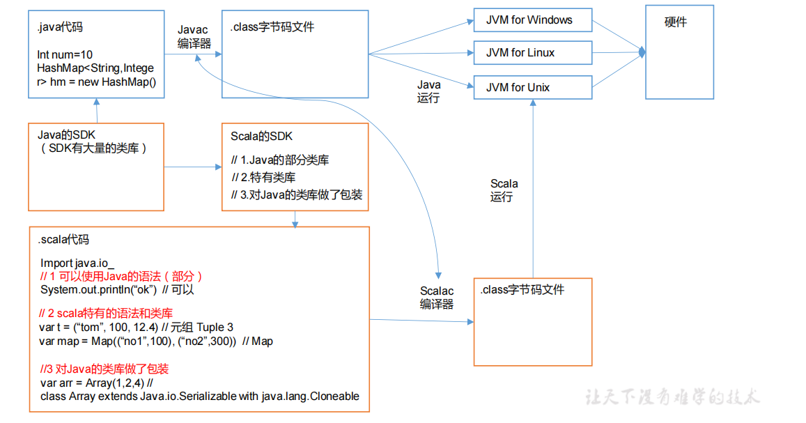 一般来说,学 Scala 的人,都会 Java,而 Scala 是基于 Java 的,因此我们需要将 Scala和 Java 以及 JVM 之间的关系搞清楚,否则学习 Scala 你会蒙圈。