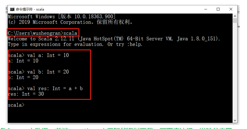 (2)输入 Scala 并按回车键,启动 Scala 环境。然后定义两个变量,并计算求和。