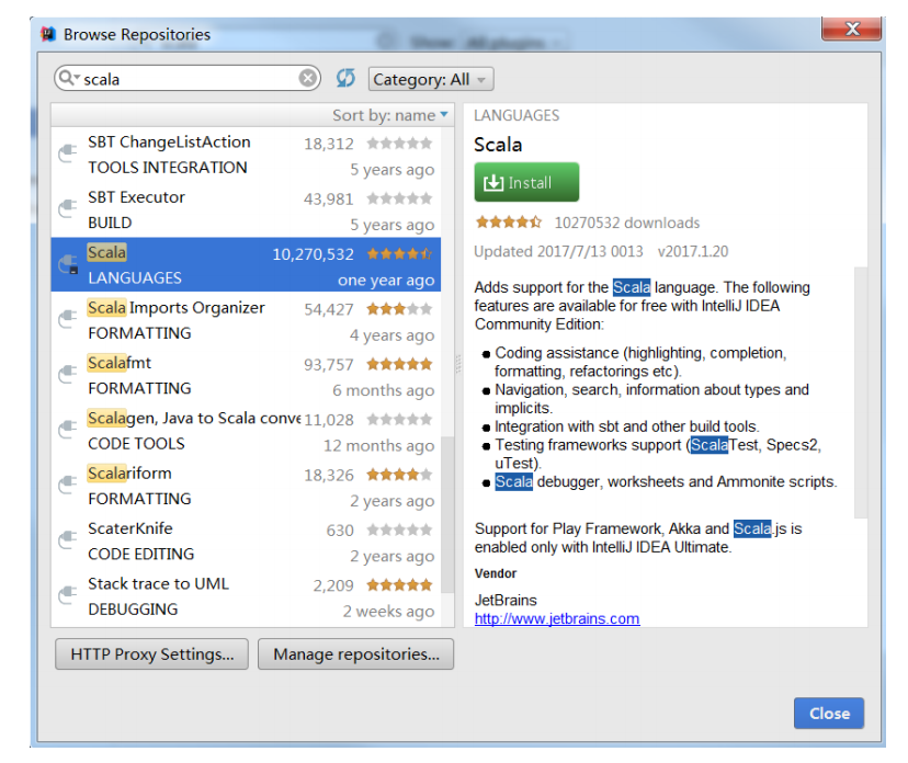 (1)在搜索插件框里面输入 Scala->点击 Install->点击 ok->点击 apply