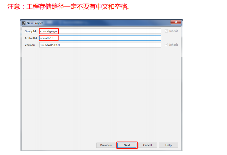 3)GroupId 输入 com.atguigu->ArtifactId 输入 scala->点击 next->点击 Finish
