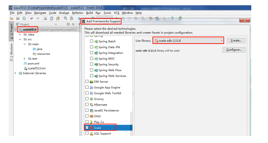 注意:如果是第一次引入框架,Use libary 看不到,需要选择你的 Scala 安装目录,然后工具就会自动识别,就会显示 user libary。