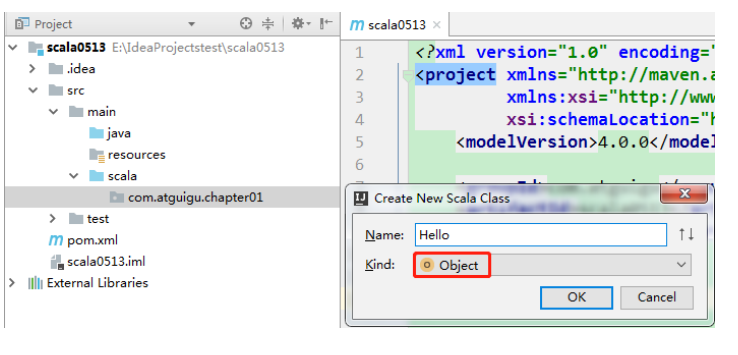 右键点击 com.atguigu.chapter01->New->Scala Class->Kind 项选择 Object->Name 项输入