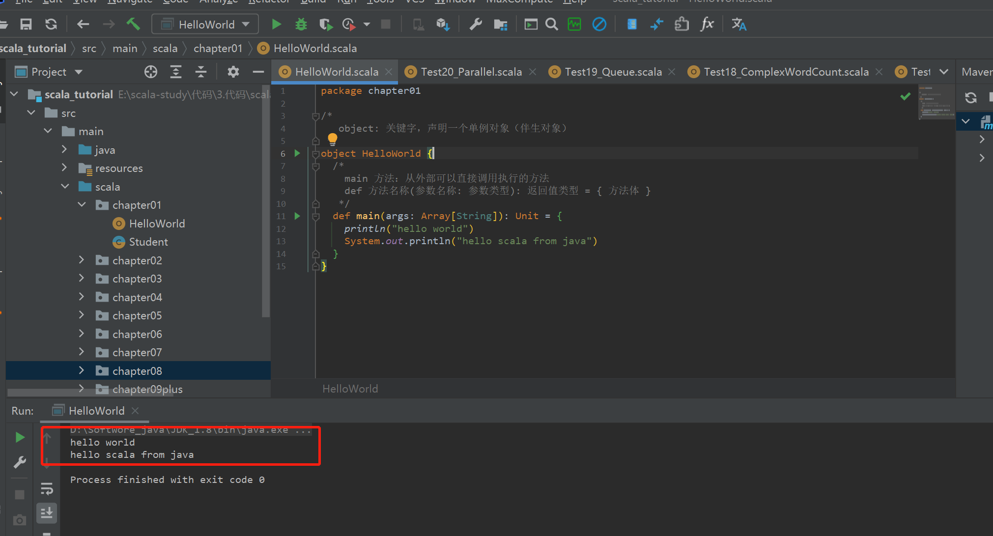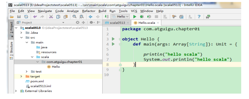 7)在 scala 包下,创建包 com.atguigu.chapter01 包名和 Hello 类名,