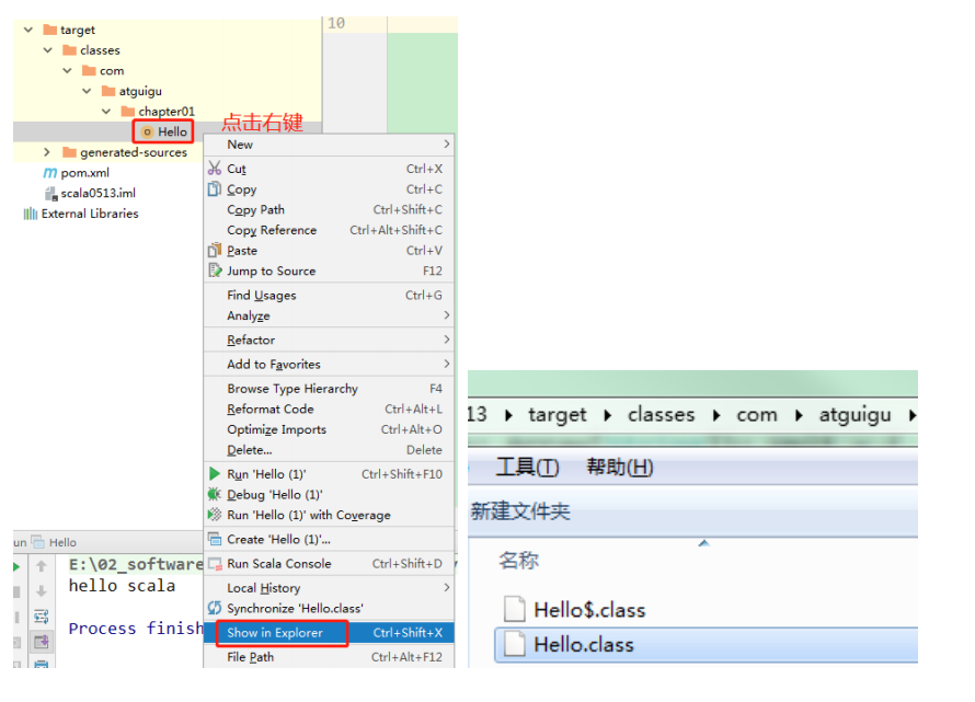 1)在项目的 target 目录 Hello 文件上点击右键->Show in Explorer->看到 object 底层生成