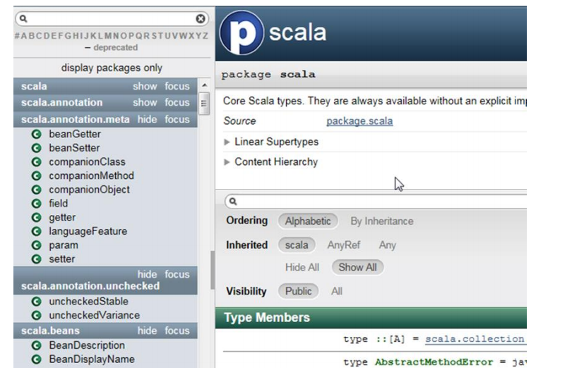 2)离线查看:解压 scala-docs-2.11.8.zip,可以获得 Scala 的 API 操作。