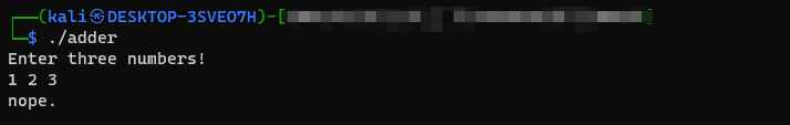 接着,就可以执行看看!跑起来如下图所示,会先跟使用者要三个数字,然后进行某些判断,错误就会像这样印出 nope.。因此,我们可以判断拿到 flag 的條件就是让这三個数字符合某些关系,检查通过了就会印出 flag。