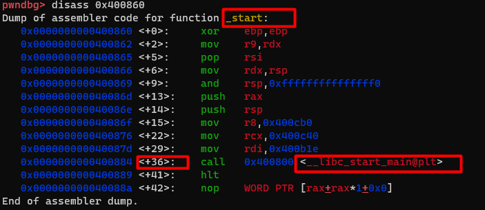 其实在编译的过程中,编译器会加入一个进入点函数,负责初始化一些 gcc/glibc 的准备工作后再调用main函数 ,可以想成是在我们的程序外多加一层包装来整顿好环境再开始执行主逻辑。 所以,我们可以看到在_startmain<+36>的地方调用<__libc_start_main@plt>,其实也就是通过libc的函数再间接调用我们所撰写的主程序main 。