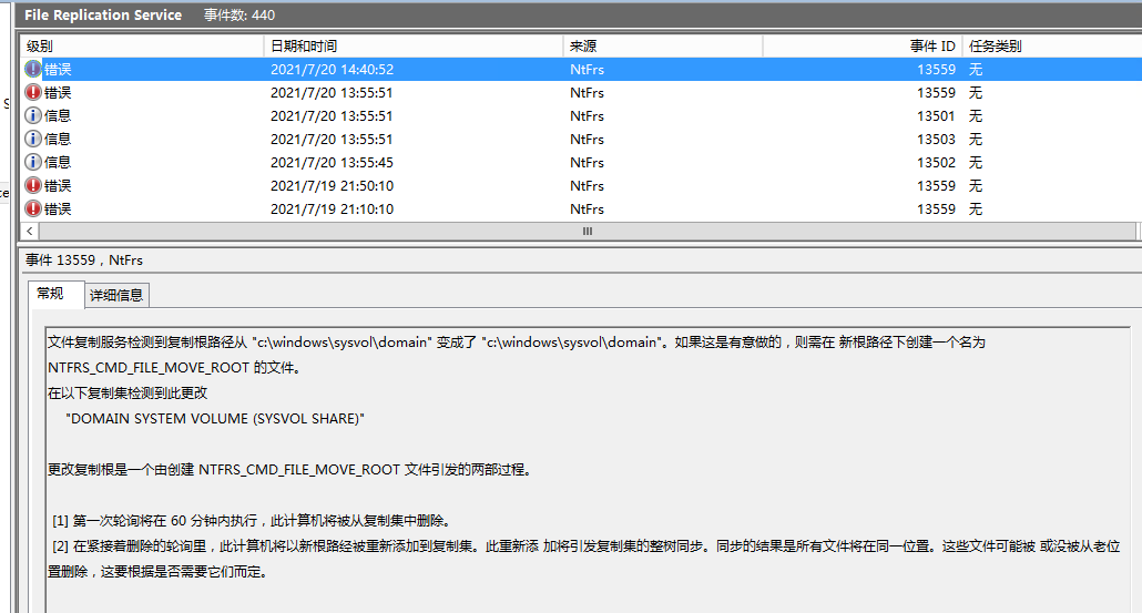 更多详细信息查看 https://docs.microsoft.com/zh-cn/troubleshoot/windows-server/networking/ntfrs-error-event-13559-replication-stops