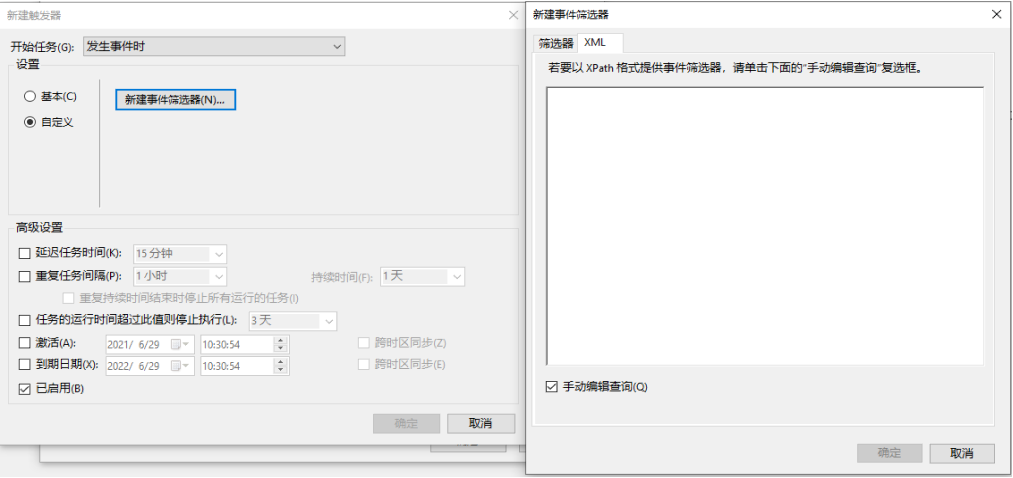 需求: 工作中需要计划任务中启动的程序长时间运行,开始使用的是1分钟定期进行启动,如果启动了就忽略。但是LOG每分钟都会出现一个已启动的警告。所以使用了触发器的方式进行退出检测。