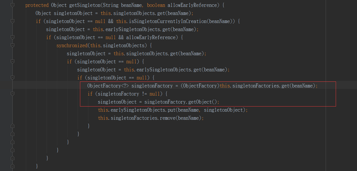 图中的singletonFactories就是三级缓存,一个初始化大小为16的HashMap,它的value是一个lambda表达式,执行表达式里的getObject()方法就会返回一个对象(一个不完整的对象)